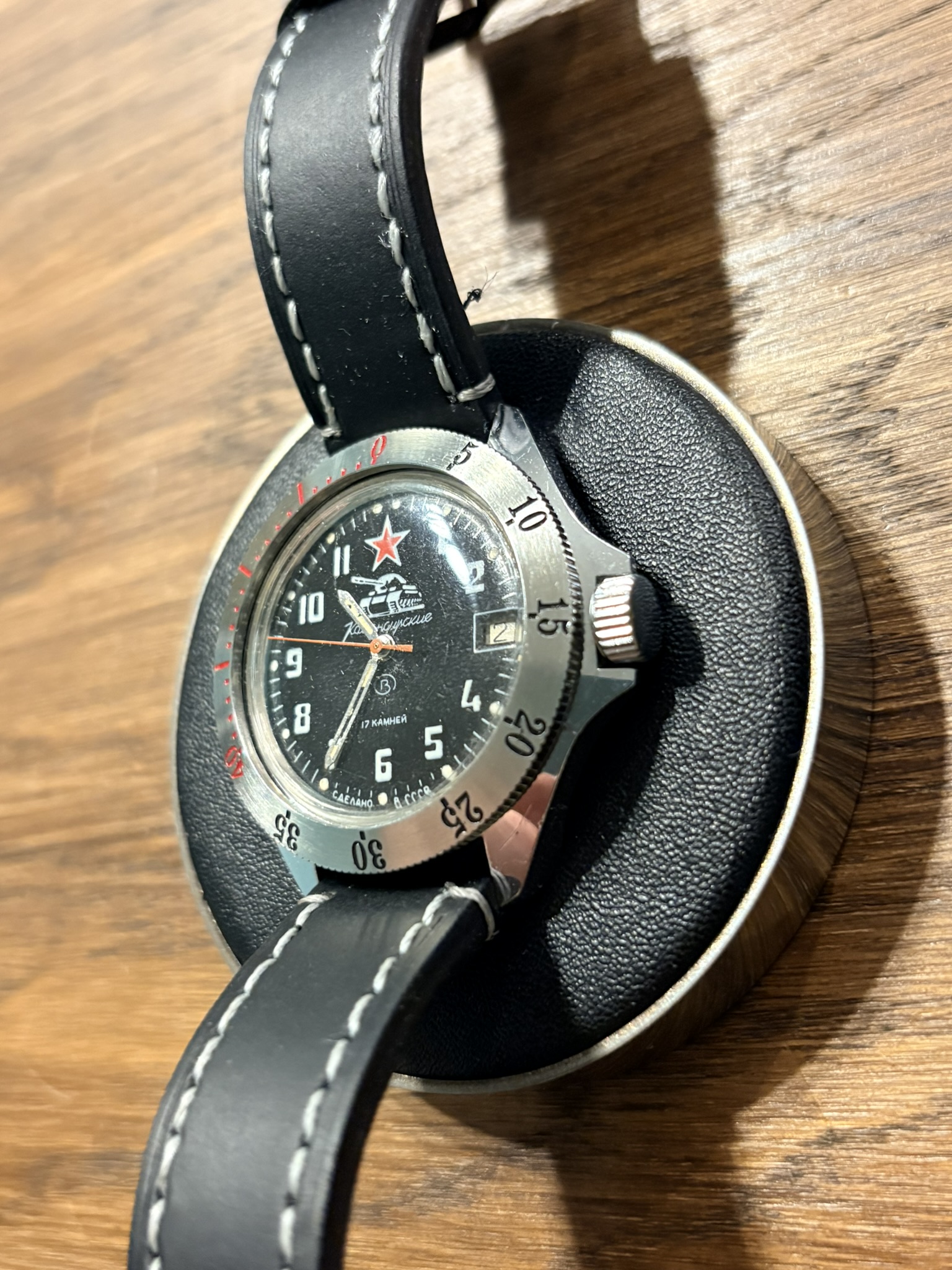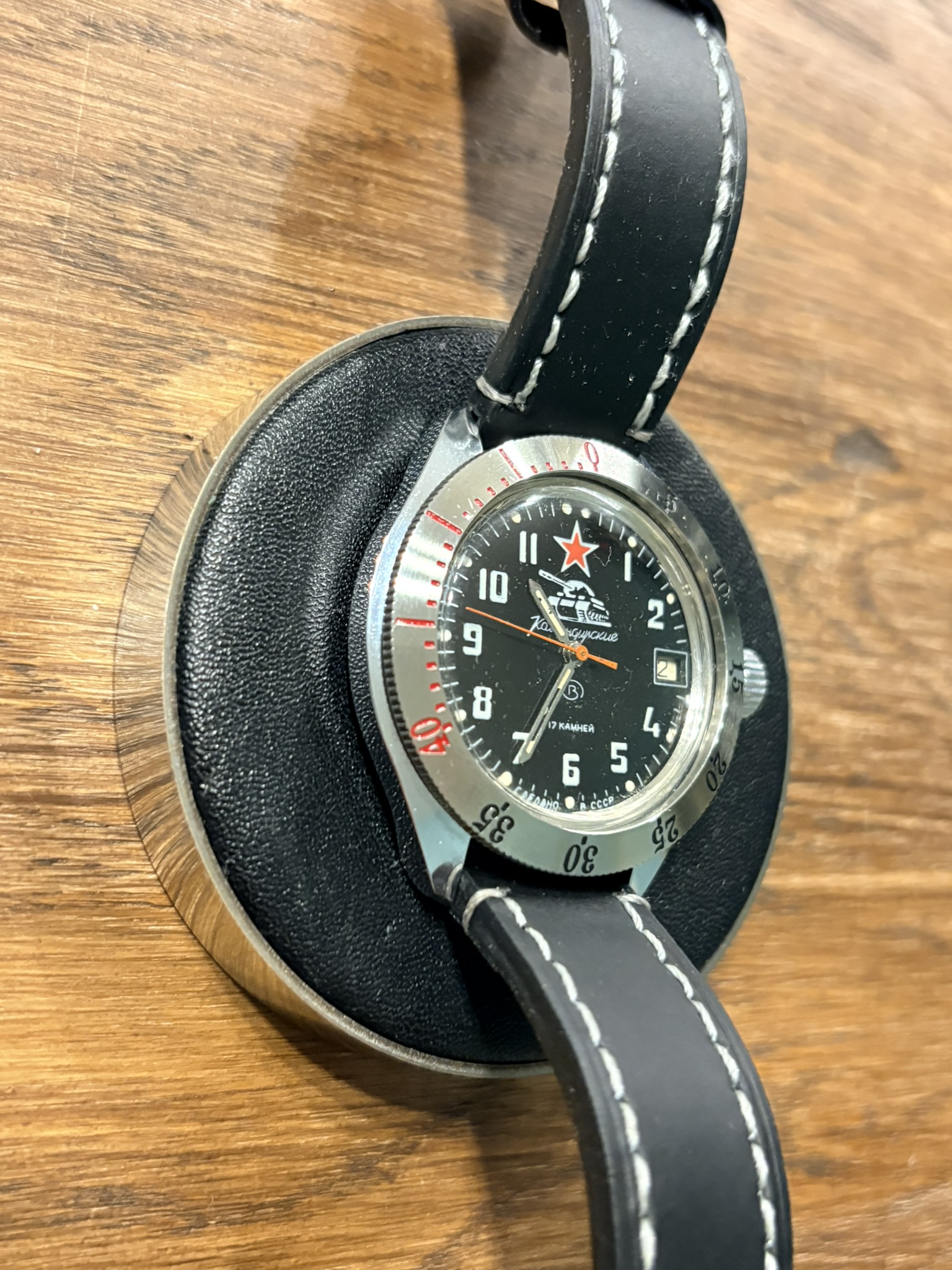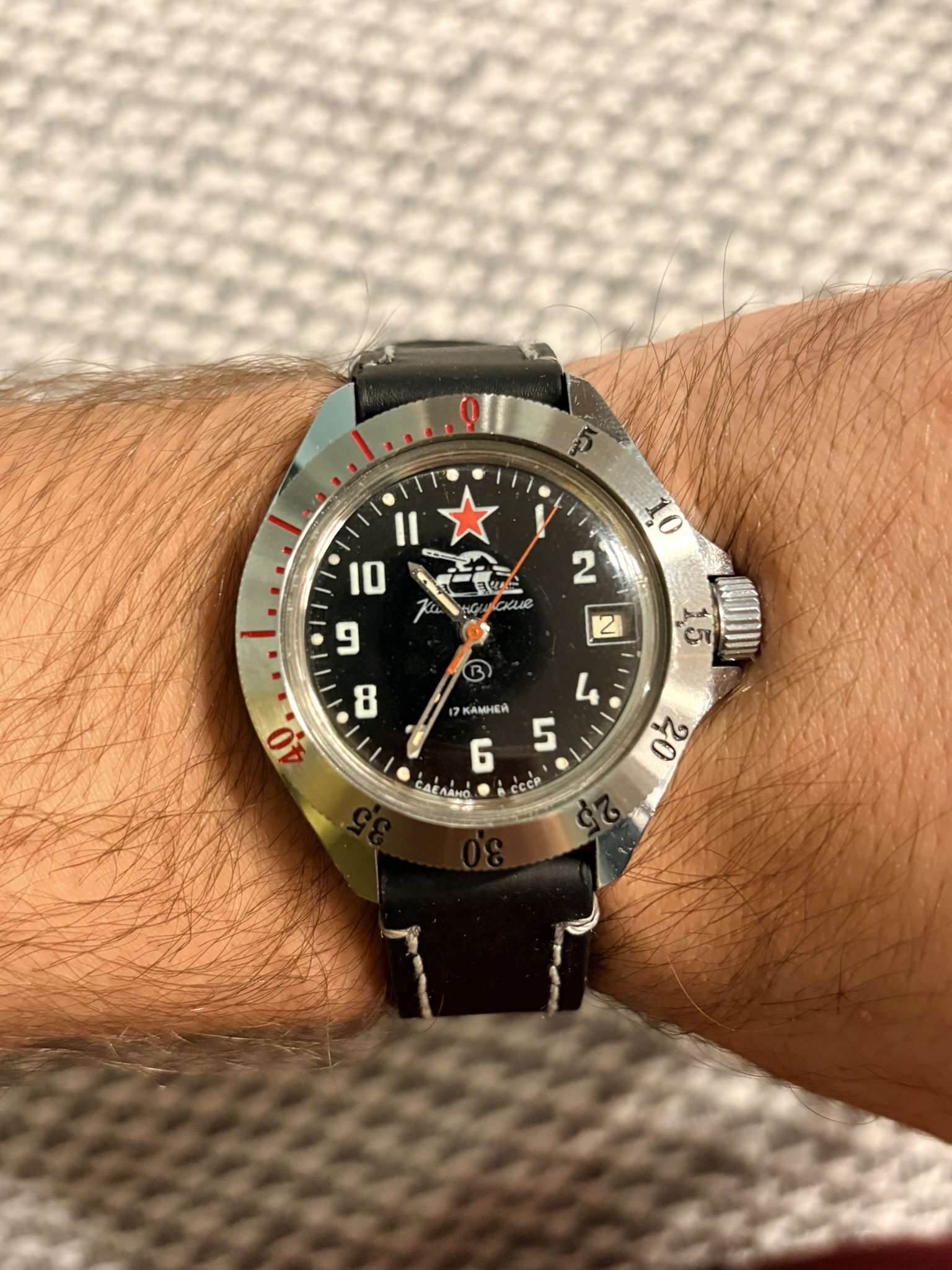 Koperta w tym modelu ma klasyczny, lekko beczkowaty kształt charakterystyczny dla zegarków produkowanych w ZSRR w latach 70–80. Nie jest to diver jak Amphibia – Komandirskie to bardziej zegarek codzienny, lżejszy i prostszy konstrukcyjnie. Vostok Komandirskie dobrze układa się na nadgarstku i jest wygodny w noszeniu przez cały dzień. Rozmiar w okolicach 39 mm sprawia, że zegarek jest uniwersalny i pasuje do różnych stylów.